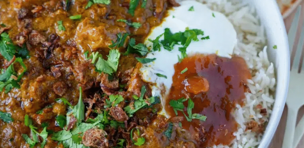 - Serve – Add the coriander and stir it through (if using). Serve the curry heaped on basmati rice with a side of naan bread. Dollop some yoghurt and mango chutney on top. Sprinkle with extra coriander (if using) and crispy fried shallots. Serve immediately.